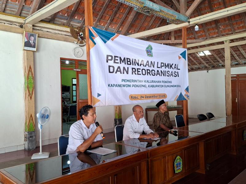Pemerintah Kalurahan Ponjong menyelenggarakan kegiatan Pembinaan dan Reorganisasi Lembaga Pemberdayaan Masyarakat Kalurahan (LPMKal) Ponjong pada Rabu, 24 Desember 2025, bertempat di Aula Balai Kalurahan Ponjong, mulai pukul 13.00 WIB.